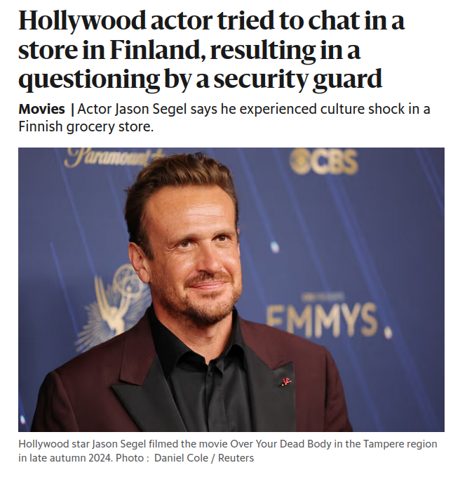 >“I always try to be friendly. I say hello and ask how people are doing. However, that didn’t work in Finland, where people are quite reserved,” Segel told Jimmy Kimmel on Tuesday (April 7).>The actor tried making small talk with grocery store workers, but they seemingly mistook his kindness for something else entirely.>“I was walking to my car, and a female security guard followed me. She was big, tattooed, and resembled Dolph Lundgren’s character in Rocky,” Segel recalled.>According to Segel, the guard asked him for his car keys, saying he was “clearly high because I had greeted people and was staring at the cereal shelf.”>Segel had spent a long time in the cereal aisle because he was confused by the product descriptions written in Finnish on the packages.What a weird fucking people the finns are, no wonder they can't get along with the russians.