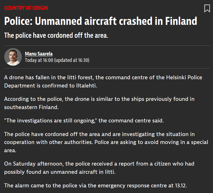 >Police: Unmanned aircraft crashed in Finland>A drone has fallen in the Iitti forest, the command centre of the Helsinki Police Department is confirmed to Iltalehti.>According to the police, the drone is similar to the ships previously found in southeastern Finland.damn hohol ufos invaded our space again>>532950344kek, I read about that yesterday