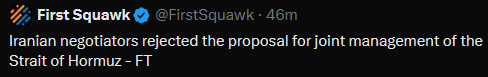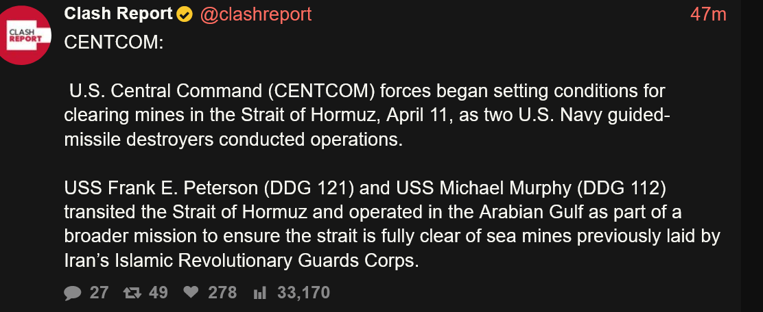 OP needs his hugbox so I'll put it here>WALL STREET JOURNAL>Two U.S. Navy guided-missile destroyers passed through the Strait of Hormuz on Saturday, according to three U.S. officials>No issues were reported, and the move was described as a freedom-of-navigation mission.https://xcancel.com/shelbyholliday/status/2042963213088596423PASSED THROUGH>NO ISSUES REPORTEDPASSED THROUGH>NO ISSUES REPORTED