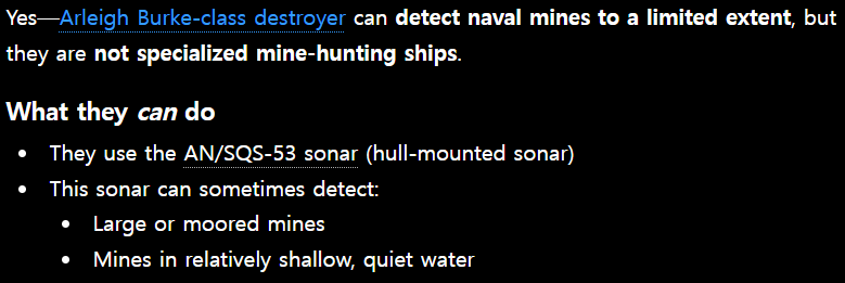 >>532960662Indeed, an Arleigh Burke-class destroyer can detect many types of mines and steer around them if the density is low enough. But a cargo ship can't do that.