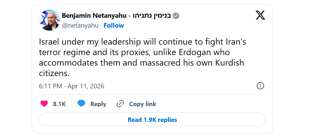 Prime Minister Netanyahu attacks Turkish President Erdogan in an English tweet on X: "Under my leadership, Israel will continue to fight against the Iranian terror regime and its agents, unlike Erdogan who assists them and even massacres his Kurdish citizens"