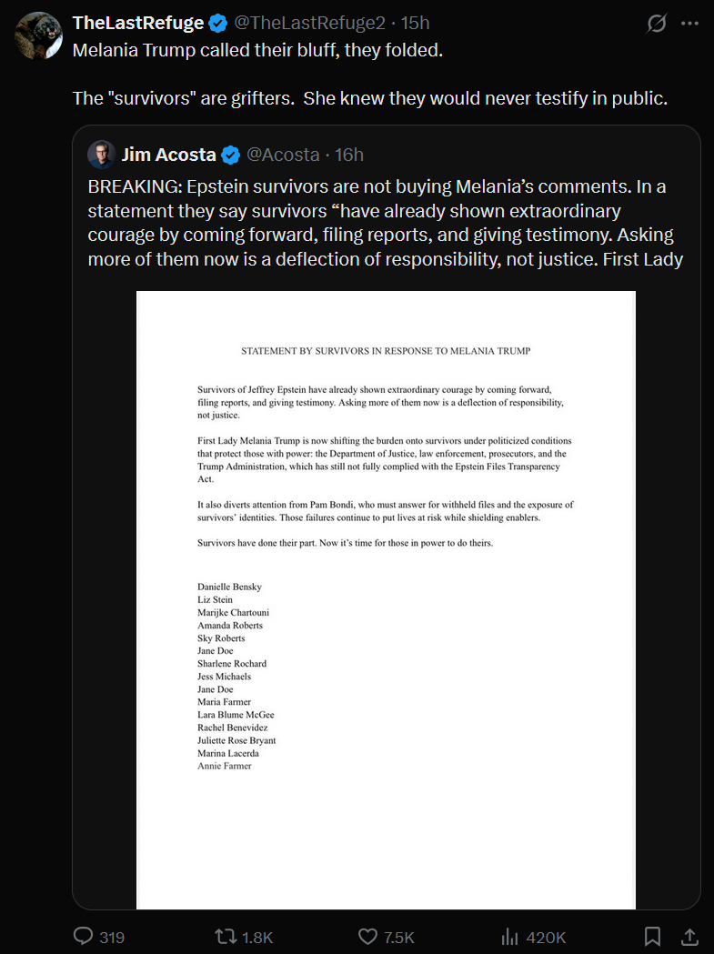 >Melania says "epstein survivors" should testify under oath>"epstein survivors" suddenly have no interest in telling their storiesMany such cases.