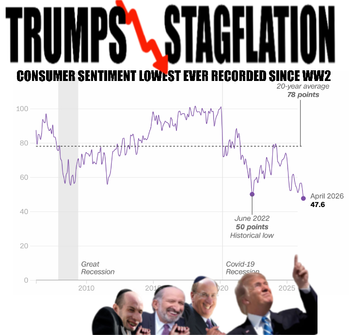 >>532968343CONSUMER SENTIMENT LOWEST RECORDED SINCE WW2>Consumer survey released Friday showed that sentiment declined 11% early this month to a reading of 47.6, lower than anything seen in the post World War II era, including during the Great Recession, the pandemic downturn and the historic inflation surge afterward.INFLATION SKYROCKETS>Meanwhile, Americans’ expectations for inflation in the year ahead surged a full percentage point early this month to 4.8%, the biggest monthly increase in a year, when Trump unveiled his sweeping “Liberation Day” tariffs.CONSUMER PRICES UP HIGHEST IN 2 YEARS>In a separate report Friday, the Bureau of Labor Statistics reported that the Consumer Price Index surged 0.9% in March, the sharpest monthly increase since 2022, pushing the annual rate to 3.3%, the highest in nearly two years.https://www.cnn.com/2026/04/10/economy/us-consumer-sentiment-record-low-april