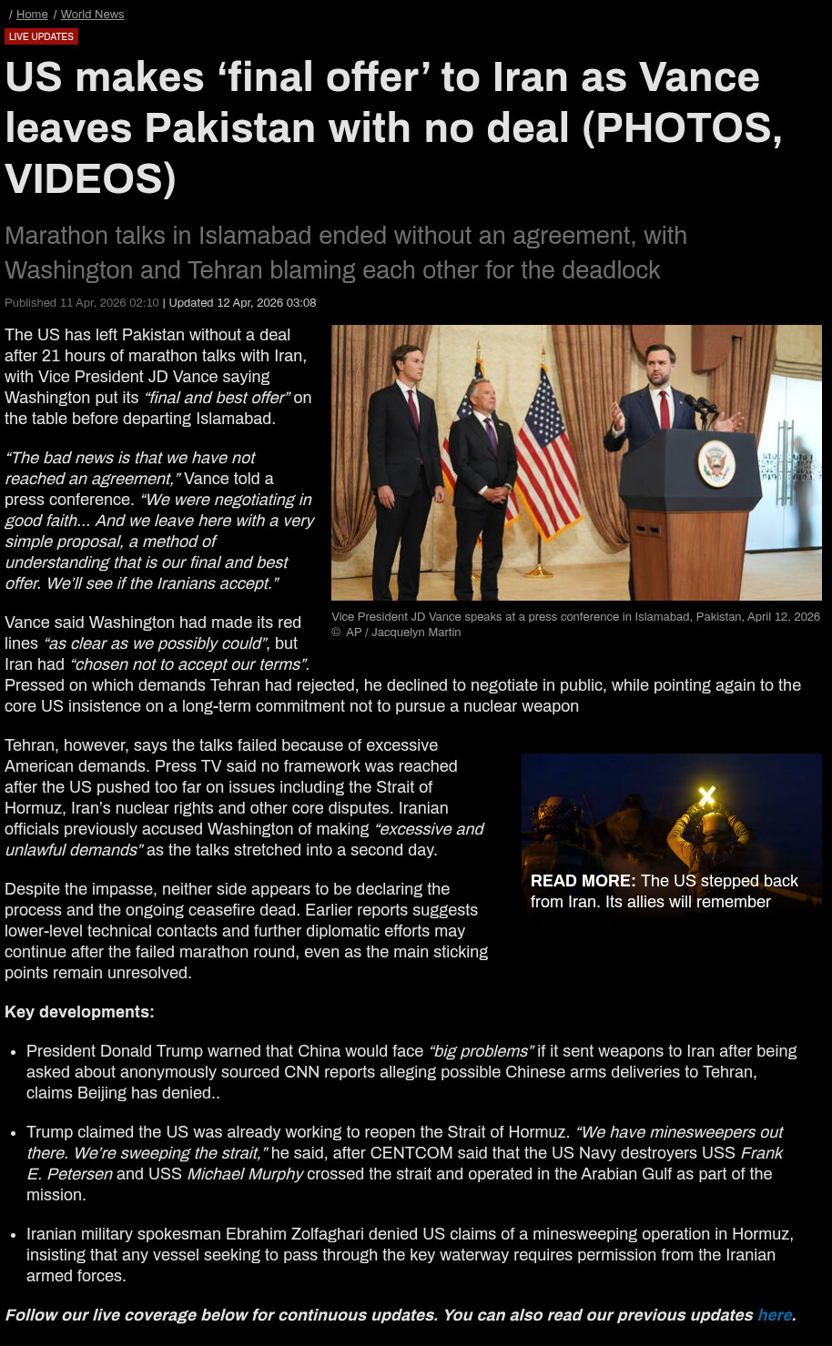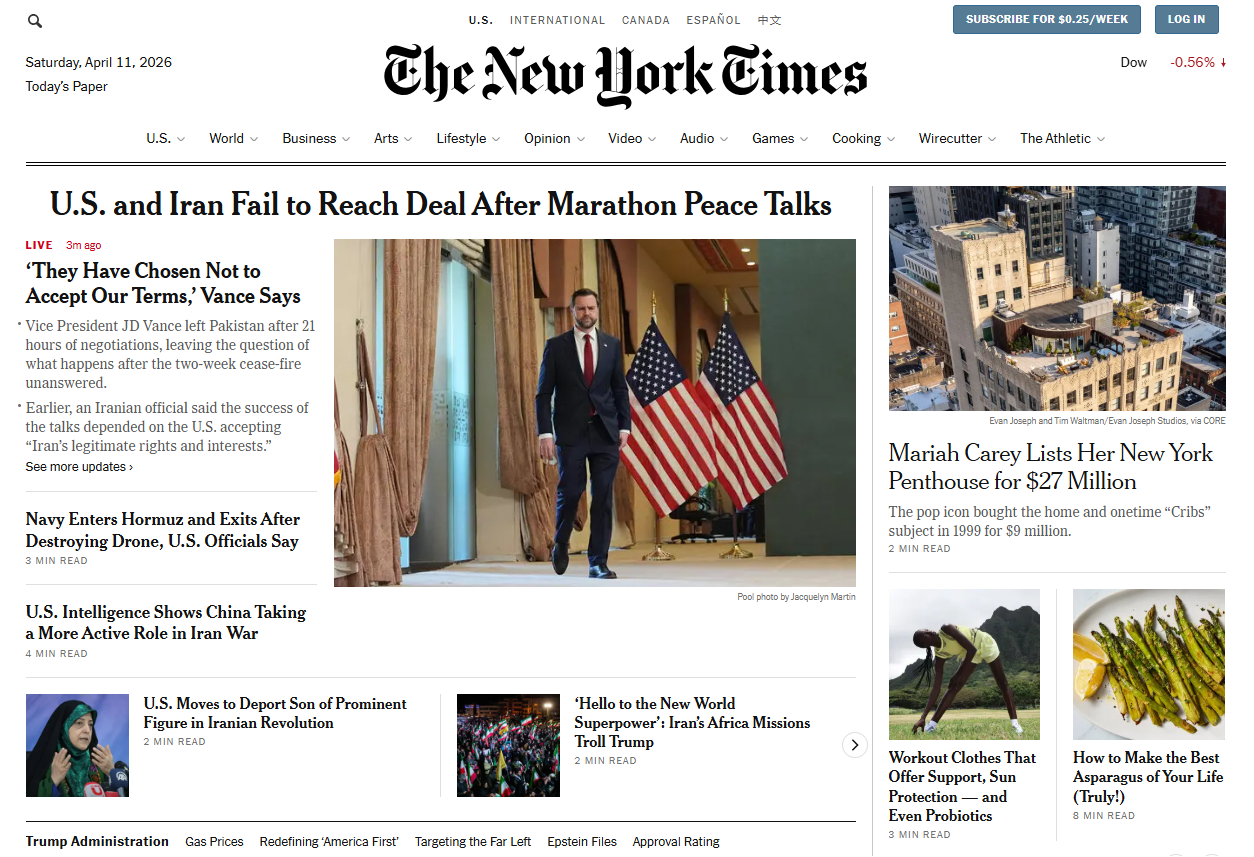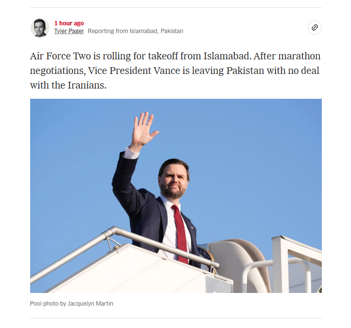 >U.S. and Iran Fail to Reach Deal After Marathon Peace Talks — The New York Times>‘They have chosen not to accept our terms,’ Vance says>Vice President JD Vance left Pakistan after 21 hours of negotiations, leaving the question of what happens after the two-week cease-fire unanswered.>Earlier, an Iranian official said the success of the talks depended on the U.S. accepting “Iran’s legitimate rights and interests.”