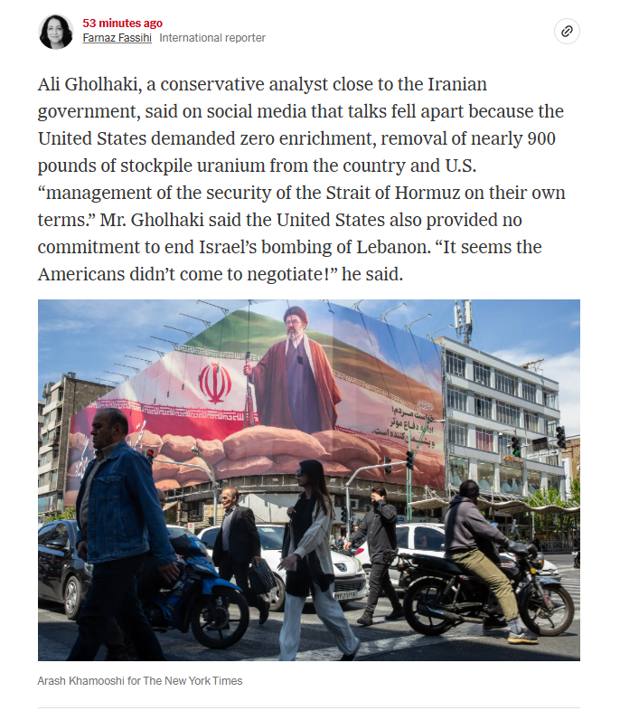 >Ali Gholhaki, a conservative analyst close to the Iranian government, said on social media that talks fell apart because the United States demanded zero enrichment, removal of nearly 900 pounds of stockpile uranium from the country and U.S. “management of the security of the Strait of Hormuz on their own terms.”>Gholhaki said the U.S. also provided no commitment to end Israel’s bombing of Lebanon. “It seems the Americans didn’t come to negotiate!” he said.