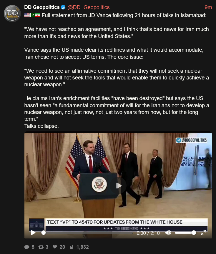 >Full statement from JD Vance following 21 hours of talks in Islamabad:>"We have not reached an agreement, and I think that's bad news for Iran much more than it's bad news for the United States.">Vance says the US made clear its red lines and what it would accommodate, Iran chose not to accept US terms. The core issue:>"We need to see an affirmative commitment that they will not seek a nuclear weapon and will not seek the tools that would enable them to quickly achieve a nuclear weapon.">He claims Iran's enrichment facilities "have been destroyed" but says the US hasn't seen "a fundamental commitment of will for the Iranians not to develop a nuclear weapon, not just now, not just two years from now, but for the long term.">Talks collapse.https://files.catbox.moe/292is5.mp4