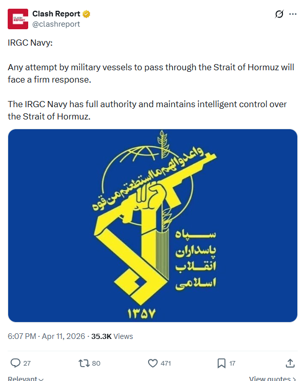 >IRGC Navy statement:>“Any attempt by military vessels to pass through the Strait of Hormuz will face a firm response.>The IRGC Navy has full authority and maintains intelligent control over the Strait of Hormuz.”