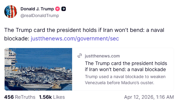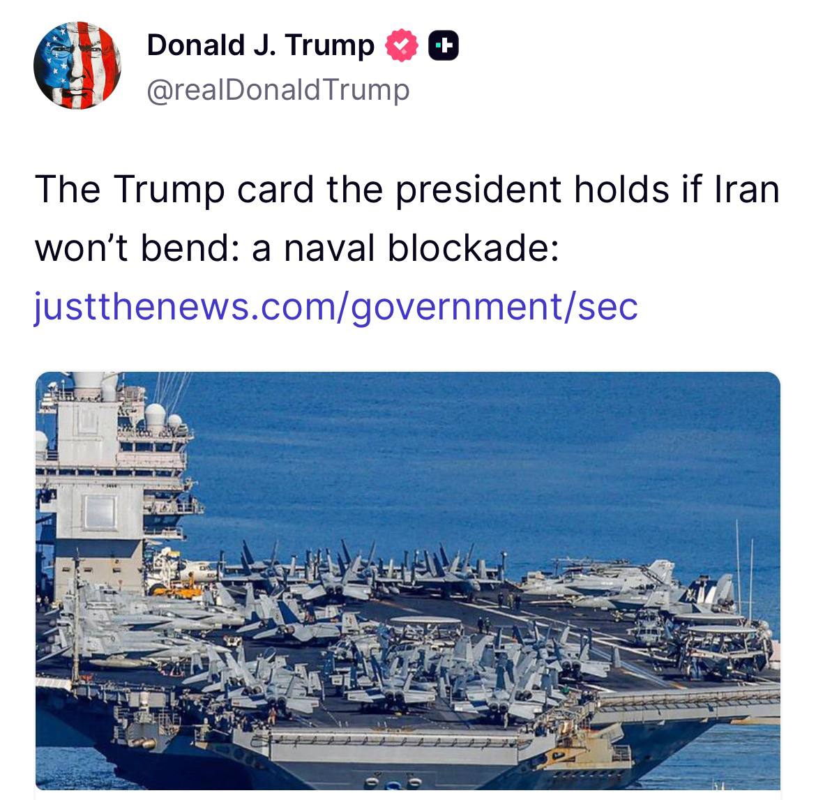 >Trump is threatening Iran with a naval blockade – 21 minutes ago on TruthSocial