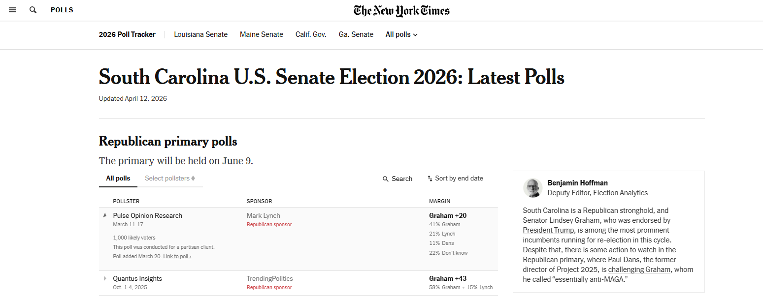 >Lindsey Graham has dropped 23 points in the South Carolina primary polls between October and the second week of March, as the fallout of the 2026 Iran war is yet to take its full effect into Trump-endorsed candidates and establishment Republicans.