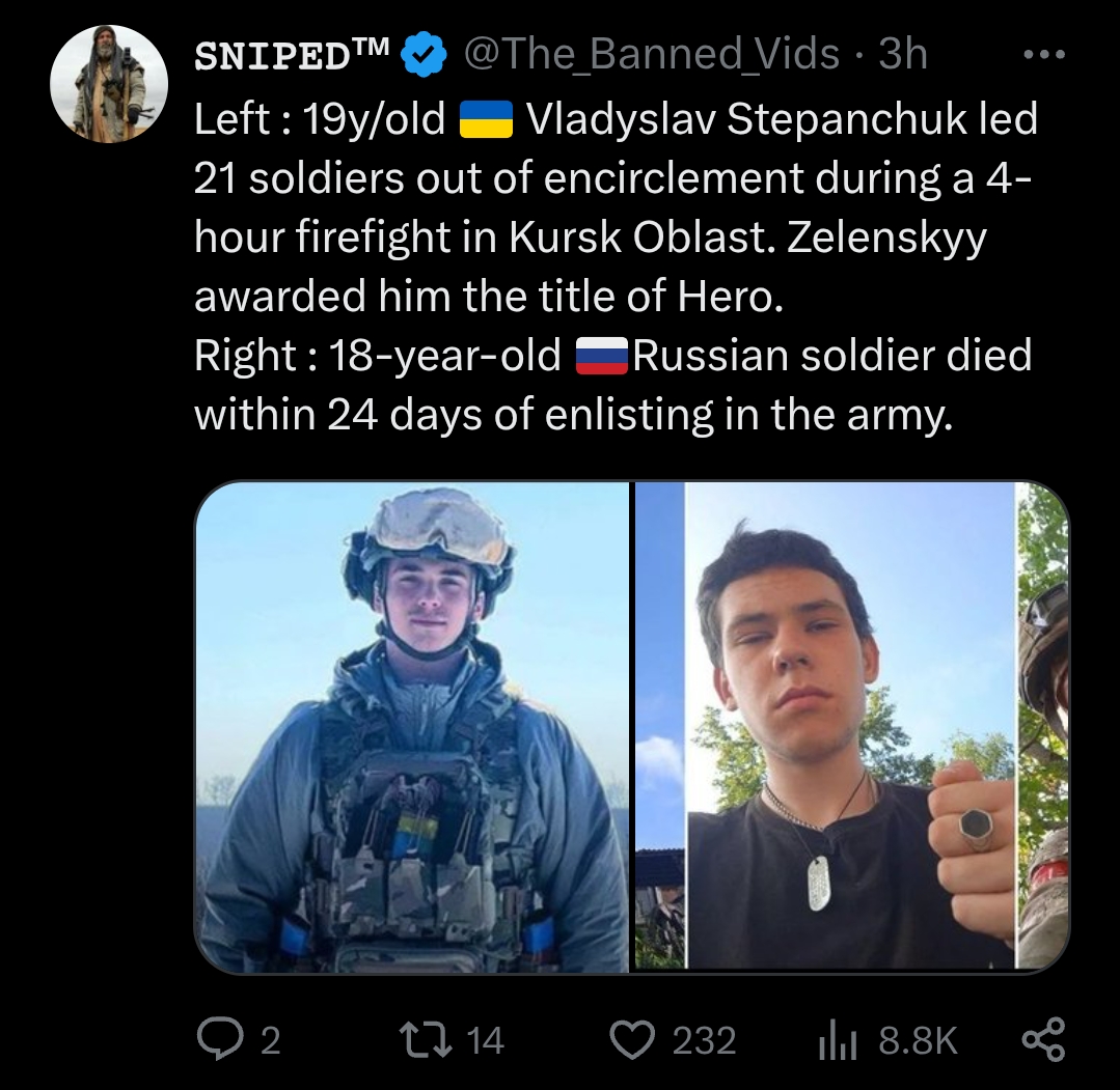 >>533004866>Ukrainian soldiers move artillery to the Kursk border>Surveillance drone identifies them>They get instantly shelled and droned>Commander and gunner severely wounded>Soldiers from other units without ammo and comms>Somehow this is sold by the military as a win achieved by a kid who volunteered when he turned 18>Bussifying videos keep dropping daily amid a severe manpower shortageNothing to see here. Move along, move along.