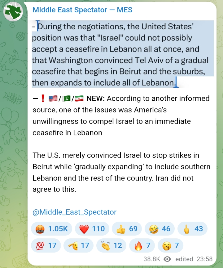 >Pakistani sources told the Qatari Al-Arabi Al-Jadid newspaper: >Several key issues have delayed progress in the negotiations between the US and Iran, primarily the issues of Lebanon and the Strait of Hormuz.>One of them said that the US "refuses to include Lebanon in any potential deal with Iran, and that the American delegation, and especially Witkopf and Kushner, wanted to transfer the entire Lebanon issue to Israel, while separating the issue the Lebanese from Iran and allow Israel to deal with Lebanon alone, either through peace or through war">The sources stated that the American position regarding the Strait of Hormuz also became a major point of contention, when the American delegation sought to postpone the issue of Hormuz to the future, in order to open it now without Iran playing a significant role.>According to the sources, the American side also requested a discussion on the issue of the Iranian missiles, which did not take place.