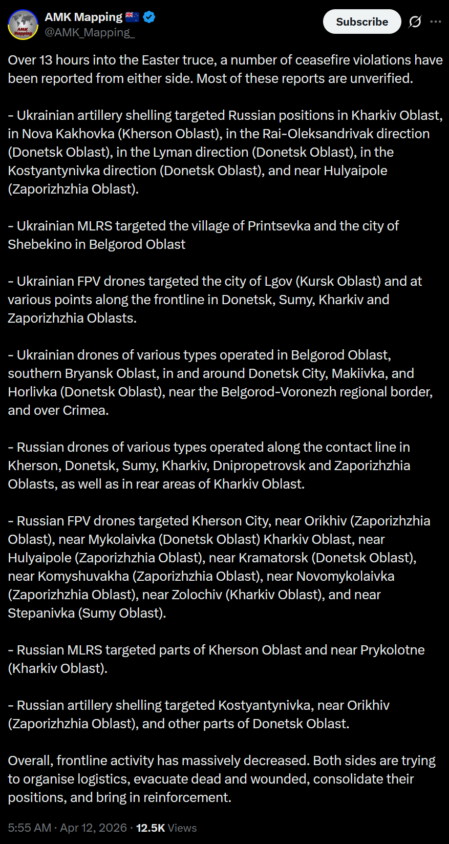 >Over 13 hours into the Easter truce, a number of ceasefire violations have been reported from either side. Most of these reports are unverified. >- Ukrainian artillery shelling targeted Russian positions in Kharkiv Oblast, in Nova Kakhovka (Kherson Oblast), in the Rai-Oleksandrivak direction (Donetsk Oblast), in the Lyman direction (Donetsk Oblast), in the Kostyantynivka direction (Donetsk Oblast), and near Hulyaipole (Zaporizhzhia Oblast). >- Ukrainian MLRS targeted the village of Printsevka and the city of Shebekino in Belgorod Oblast>- Ukrainian FPV drones targeted the city of Lgov (Kursk Oblast) and at various points along the frontline in Donetsk, Sumy, Kharkiv and Zaporizhzhia Oblasts.>- Ukrainian drones of various types operated in Belgorod Oblast, southern Bryansk Oblast, in and around Donetsk City, Makiivka, and Horlivka (Donetsk Oblast), near the Belgorod-Voronezh regional border, and over Crimea. >- Russian drones of various types operated along the contact line in Kherson, Donetsk, Sumy, Kharkiv, Dnipropetrovsk and Zaporizhzhia Oblasts, as well as in rear areas of Kharkiv Oblast.>- Russian FPV drones targeted Kherson City, near Orikhiv (Zaporizhzhia Oblast), near Mykolaivka (Donetsk Oblast) Kharkiv Oblast, near Hulyaipole (Zaporizhzhia Oblast), near Kramatorsk (Donetsk Oblast), near Komyshuvakha (Zaporizhzhia Oblast), near Novomykolaivka (Zaporizhzhia Oblast), near Zolochiv (Kharkiv Oblast), and near Stepanivka (Sumy Oblast).>- Russian MLRS targeted parts of Kherson Oblast and near Prykolotne (Kharkiv Oblast).>- Russian artillery shelling targeted Kostyantynivka, near Orikhiv (Zaporizhzhia Oblast), and other parts of Donetsk Oblast.>Overall, frontline activity has massively decreased. Both sides are trying to organise logistics, evacuate dead and wounded, consolidate their positions, and bring in reinforcement.damn truce breakers
