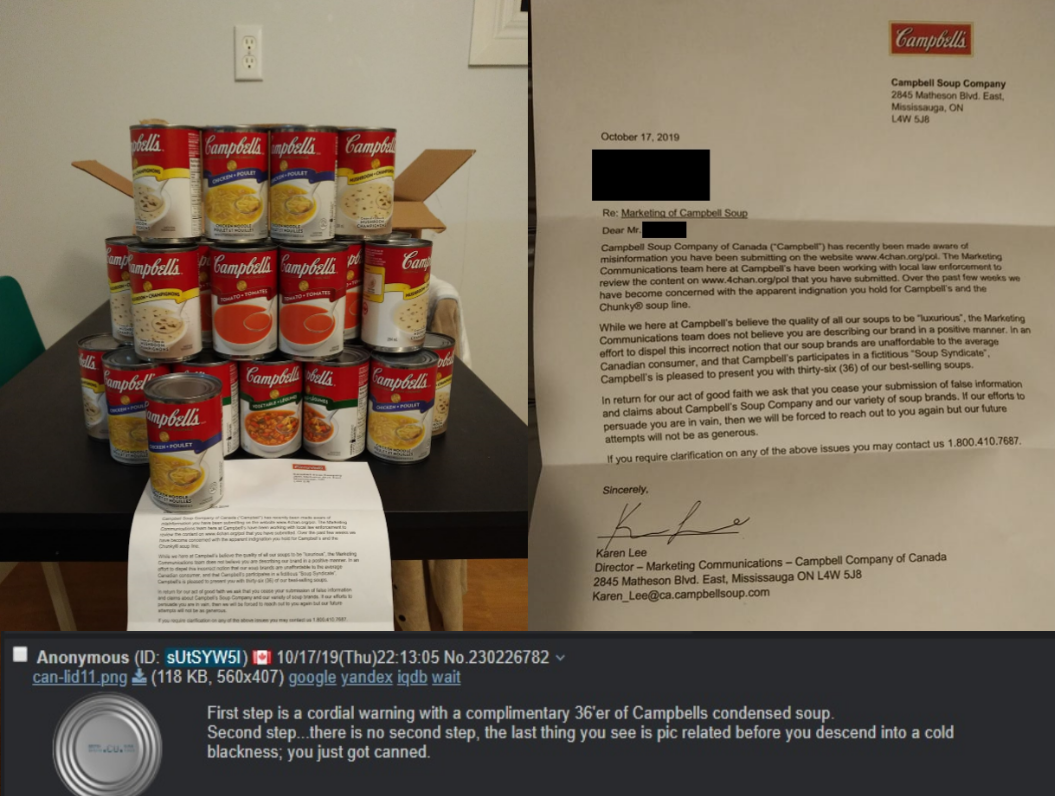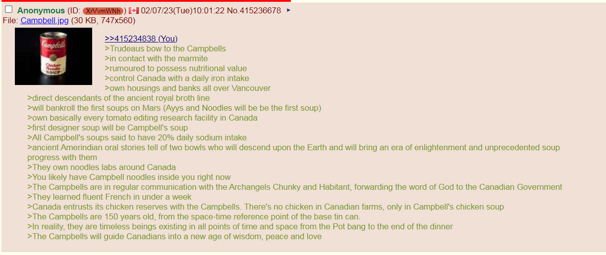 >>533046478Maybe leaf. Let me tell you about a strange experience I had on twatter. One of my Louisiana Parole Board general friends was saying Campbell's soup quality had declined. So I posted picrel to be funny and warned him about how powerful the Soup Syndicate was. 1/2