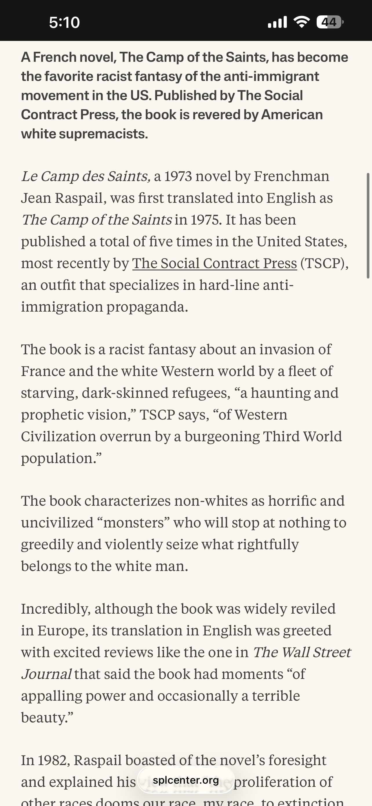 >>533056880Maybe, a very obscure one. Forgot all about that book. Surprisingly, it was written about in Le Monde 8 days ago. Pic attached is from a 2001 article by SPLC.You can share an article by clicking on the share icons at the top right of it. The total or partial reproduction of an article, without the prior written authorization of Le Monde, is strictly forbidden. For more information, see our Terms and Conditions. For all authorization requests, contact syndication@lemonde.fr. https://www.lemonde.fr/en/m-le-mag/article/2026/04/05/how-the-camp-of-the-saints-became-the-far-right-s-cult-novel-from-the-le-pens-to-maga_6752128_117.htmlThis far-right classic had only been circulating in the US in old, yellowed editions. Its editor, Ethan Rundell, 53, a former student at the School for Advanced Studies in the Social Sciences in Paris, produced a new English translation for the occasion. The Camp of the Saints is the flagship title of his small publishing house, Vauban Books, named after King Louis XIV's engineer whose fortresses are said to symbolize the defense of "natural borders." Rundell also sells a collection of texts by Renaud Camus, the originator of the conspiratorial and racist "great replacement" theory.The Camp of the Saints is a cult novel among anti-immigration ideologues, who have waved it like a pamphlet for half a century in an effort to convince people of the need to build walls. Stephen Miller, the all-powerful deputy chief of staff in the Trump administration and architect of the crackdown on undocumented immigrants in the US, recommended in 2015 that the ultraconservative news site Breitbart…(paywall)