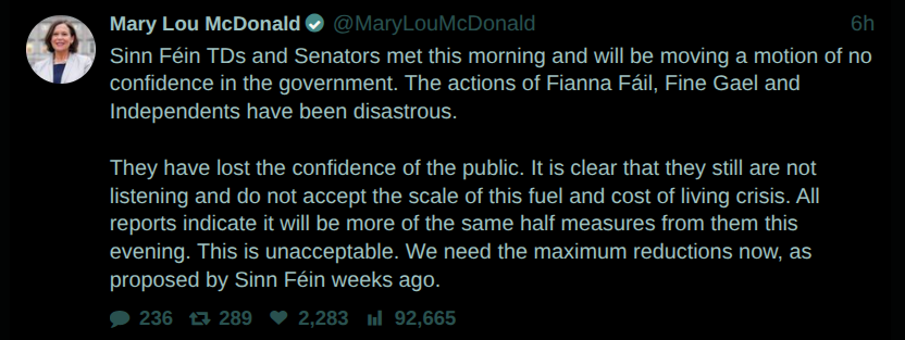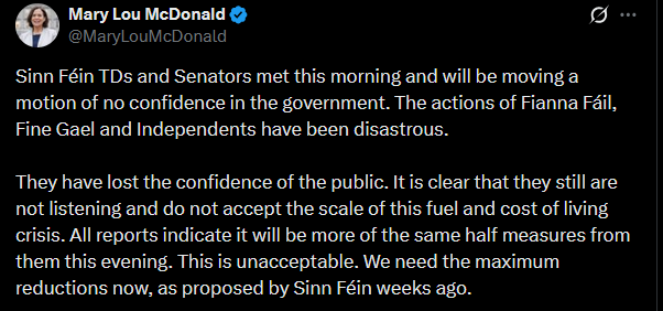 >Sinn Féin have joined the calls for a vote of no confidence in the Government.Sinn Féin have joined Aontú and Independent Ireland in their calls for a no confidence vote-and Sinn Féin have now tabled the motion.If the vote goes ahead, the Irish Government goes down.