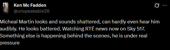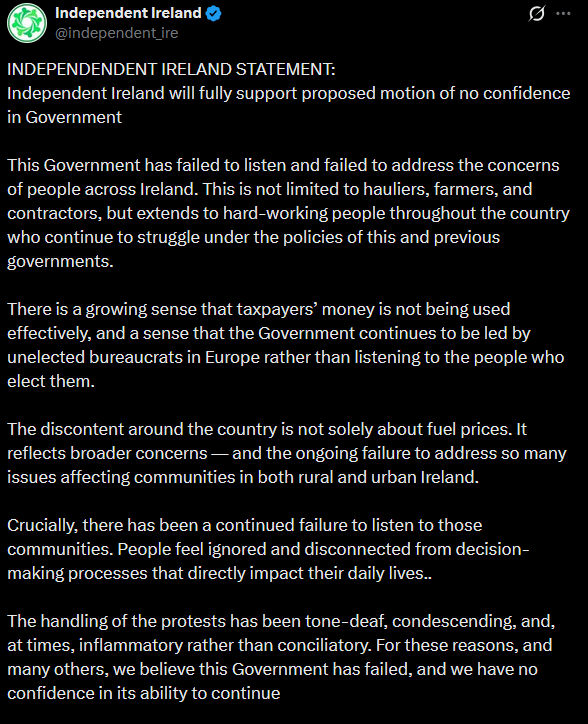 Independent Ireland's statement: they will support the no confidence motion.The fact that Aontú, Independent Ireland and Sinn Féin are the guys supporting this is very worrying for the Government. That's an alliance of Republicans (socially conservative), Conservatives+big farmers (big among FG voters) and the main left-wing party. We could see all sorts of support for bringing down the government.