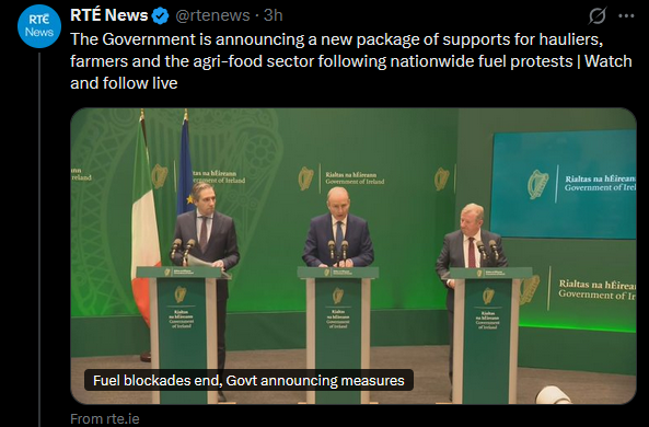 >Fuel protests, you say>no worries; tens of millions of euros coming NOW>for you? no no>for the big farmers and hauliers, of course>don't forget to pay your rent, goy!
