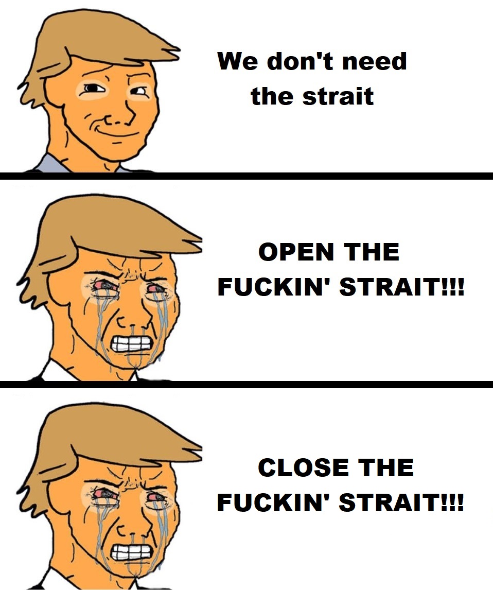 Just got here, is Trump actually doing ts?>YOU blocked the strait?!?!>Nuh uh! I'M blocking the strait!>*sticks tongue out and crosses arms*Gotta be the worst way he could've handled this, he basically admitted Iran's strategy was so good they had to copy it kek.