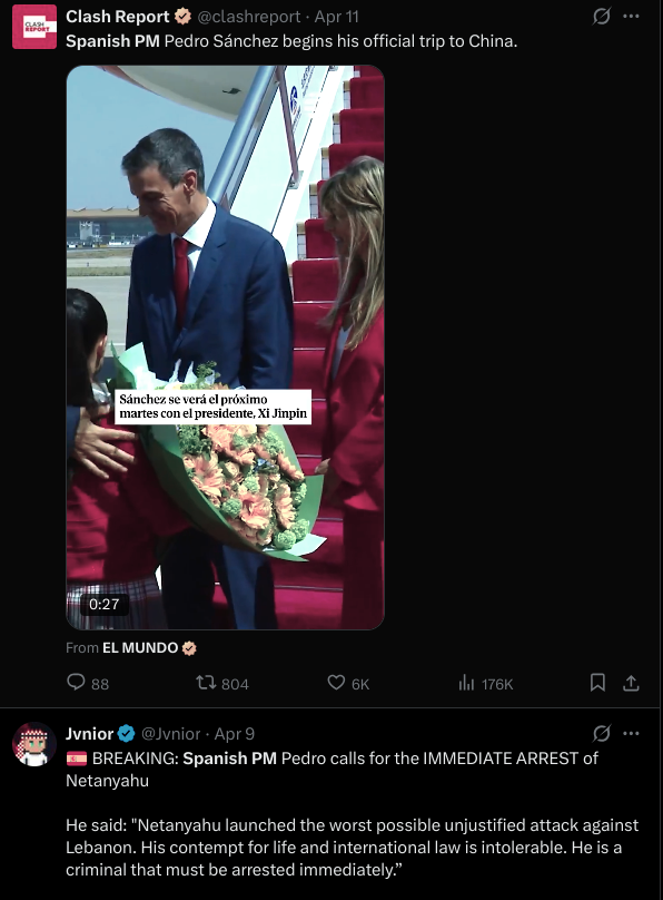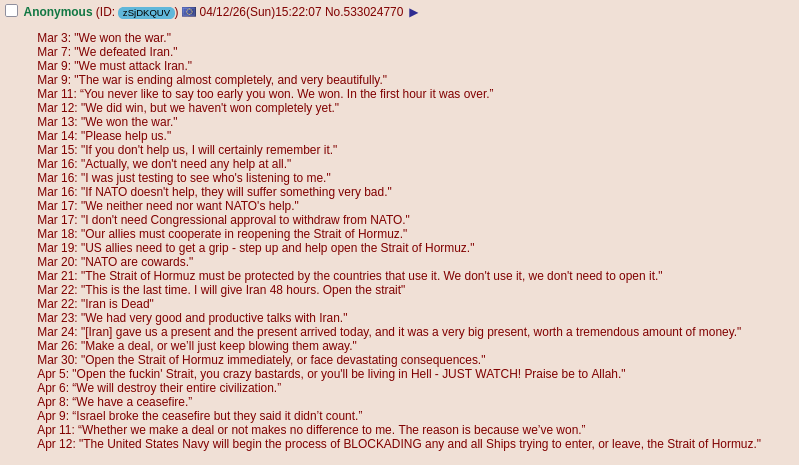 Previous >>533021503Day: 5 of the 14-day ceasefire™ period (?)Day: 44 of the Special Military Operation™▶RECENT:>Trump: United States forces will immediately “begin the process of BLOCKADING any and all Ships trying to enter, or leave, the Strait of Hormuz”.>Trump: “I have also instructed our Navy to seek and interdict every vessel in International Waters that has paid a toll to Iran. No one who pays an illegal toll will have safe passage on the high seas.”>Vance live in Pakistan: NO AGREEMENT>Putin: ready to help peace efforts in call with Iran president Pezeshkian after the failed US-Iran talks in Islamabad>EU foreign affairs spokesman: Diplomacy is “essential” for finding a peace deal in the Middle East conflict>UK’s Starmer, sultan of Oman: US and Iran should avoid further escalationIran’s Ghalibaf: US ‘failed to gain the trust’ of Iranian delegates>Dy Minister Oil: Iran hopes to restore 70-80% of its refining capability in 2 months>Iran arrests 50 for sharing sensitive locations, information with ‘enemy’ US and Israel>India, world’s 2nd largest consumer of fertilizer braces for shortages▶WARNING:>Do not trust any "happenings" without link/proof>Uкraine / Яussia discussions belong in uнg or cнug▶OILhttps://oilprice.com/oil-price-charts/▶KINO:https://files.catbox.moe/fx86zj.mp4https://files.catbox.moe/cbd7ug.mp4https://files.catbox.moe/2hwzcx.mp4https://files.catbox.moe/smmsfw.mp4https://files.catbox.moe/x0fbgv.mp4https://files.catbox.moe/20lpu8.mp4https://files.catbox.moe/86yxn2.mp4▶Live-streams:https://www.youtube.com/watch?v=4E-iFtUM2kkhttps://www.youtube.com/watch?v=TdcrT5OcS9chttps://www.youtube.com/watch?v=53G-Oy4r6M4▶Telegram channelshttps://rentry.org/tgnews▶Israel Rocket Alertshttps://www.tzevaadom.co.il/en/▶Air Traffichttps://www.flightradar24.com/https://flightaware.com/livehttps://globe.adsbexchange.com/▶Maritime Traffichttps://www.marinetraffic.com/