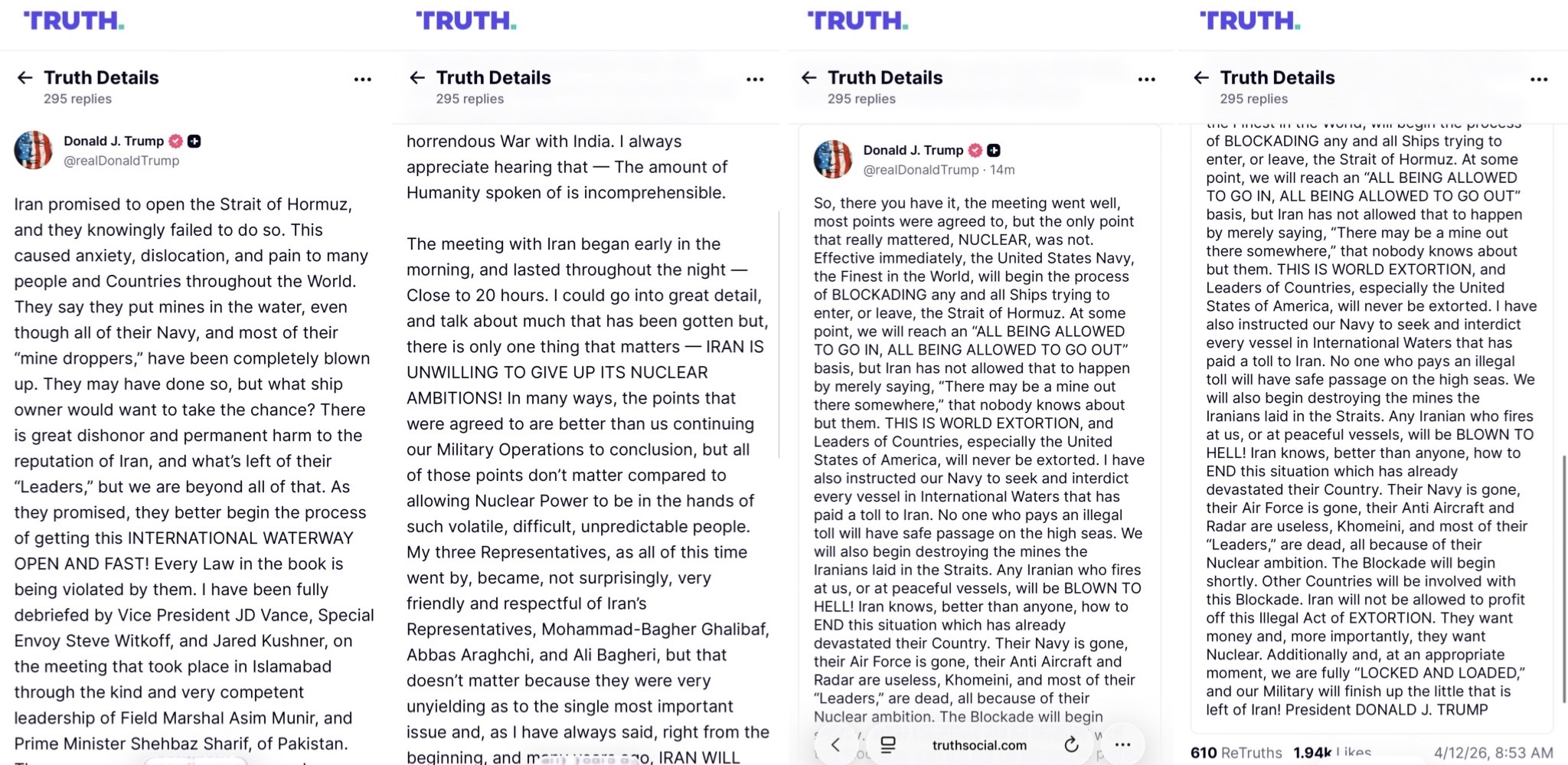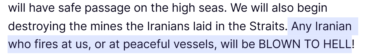 >"If Iran doesn't stop its blockade of Strait of Hormuz.... I'll do a blockade too"