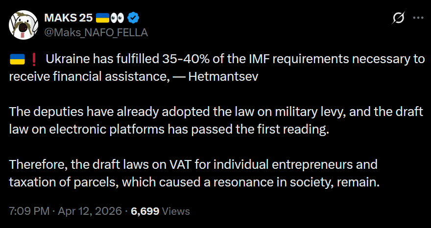 >Ukraine has fulfilled 35-40% of the IMF requirements necessary to receive financial assistance, — Hetmantsev >The deputies have already adopted the law on military levy, and the draft law on electronic platforms has passed the first reading. >Therefore, the draft laws on VAT for individual entrepreneurs and taxation of parcels, which caused a resonance in society, remain.