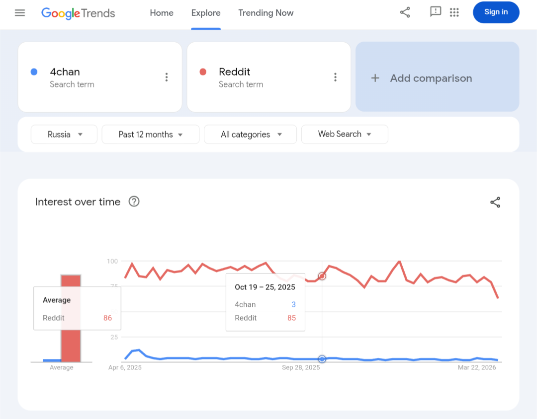I conducted a study that shows Russia’s “baseness index” (the ratio of Google searches for “4chan” to those for “Reddit”) is indeed 3.5 times higher than that of Europe (Germany).