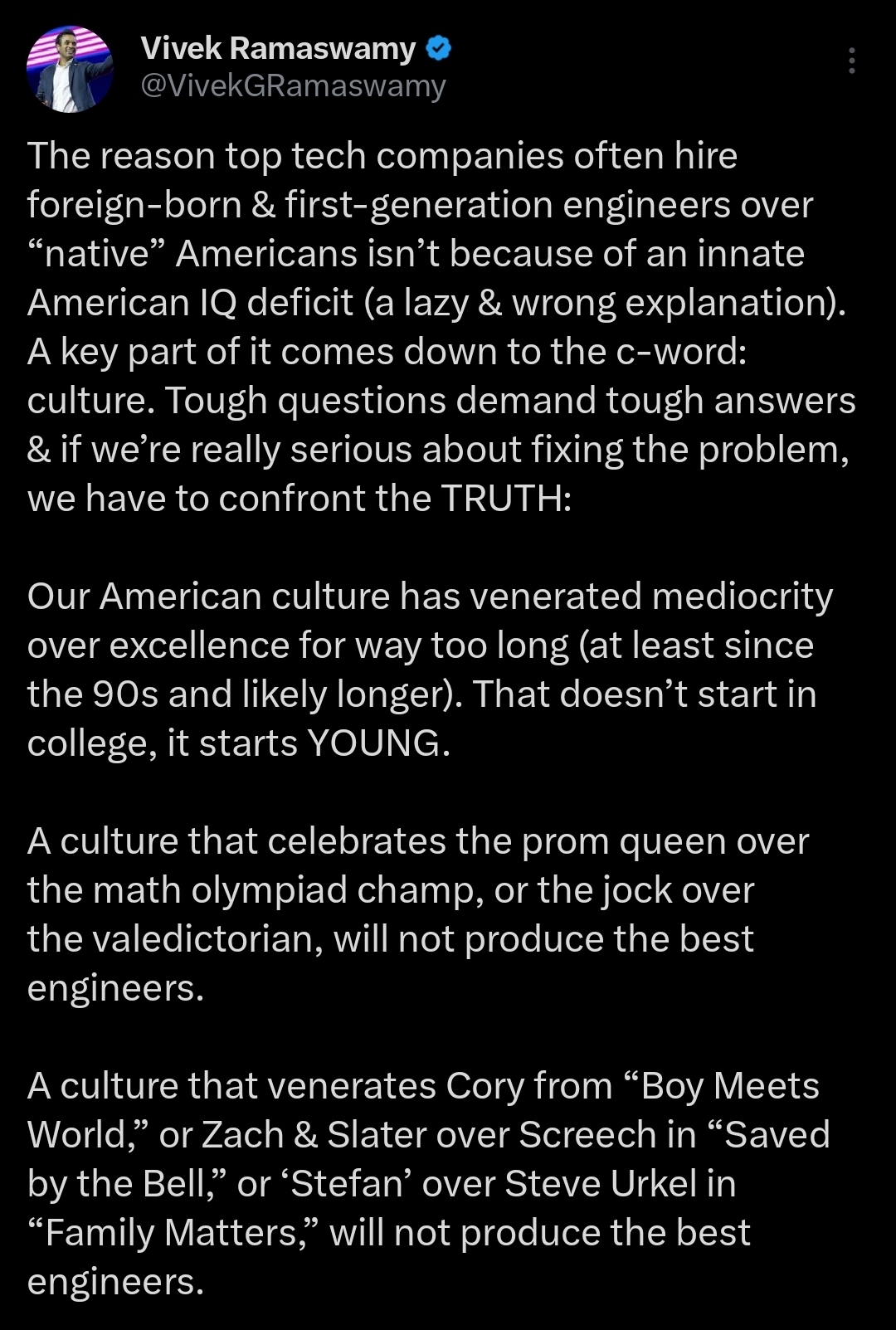 Yes, and that's why I seethe at first. But ultimately I think he's right. What other country can turn the kids if Asian PhD researchers into mediocrity establishments that wouldn't get into their parents university, even though they're top 10% in America.