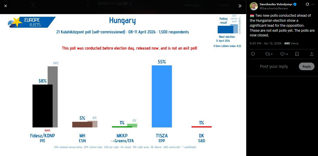 Two new polls conducted ahead of the Hungarian election show a significant lead for the opposition. These are not exit polls yet. The polls are now closed.https://x.com/SavchenkoReview/status/2043381351500353640?s=20>3m