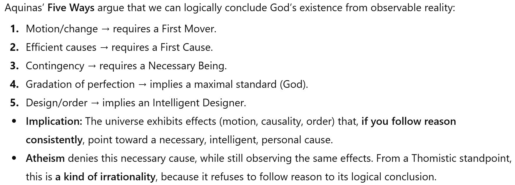>>533064210>what caused his motionHe is eternal>why a first causeInfinite regress isnt possible since clearly everything exist there was a first cause. Nothing can cause itself to exist. Only something actual can realize potency>contingent beings need a necessary beingcorrect, do you even understand what a contingent being is ontologically!?!?!?!?>perfection doesnt need to existare you ugly? i am really good looking. perfection exist. just because you cant accept it doesnt make it so>only to perceive the order blablayou cannot perceive that which is not. being precedes perception. actuality > potentiality