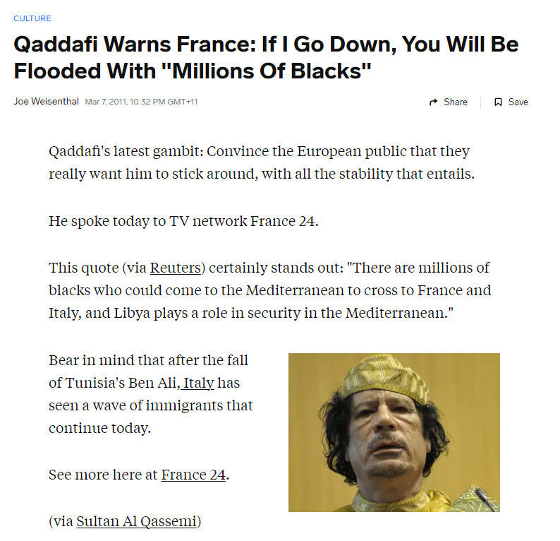 >>533059610Qaddafi was 100% based. He was too good for us, so the Zionist lizard people took him.