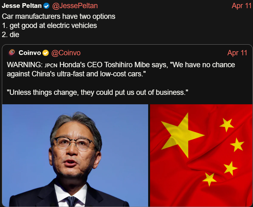 The problem is that the battery is the single largest cost component of an EV and China produces something like 90% of the cells. BYD and Xiaomi are both vertically integrated for this which flies in the face of the past fifty years of Western automotive thinking of outsourcing every little fucking thing to third party suppliers.Everyone is fucked, not just the Japanese automakers