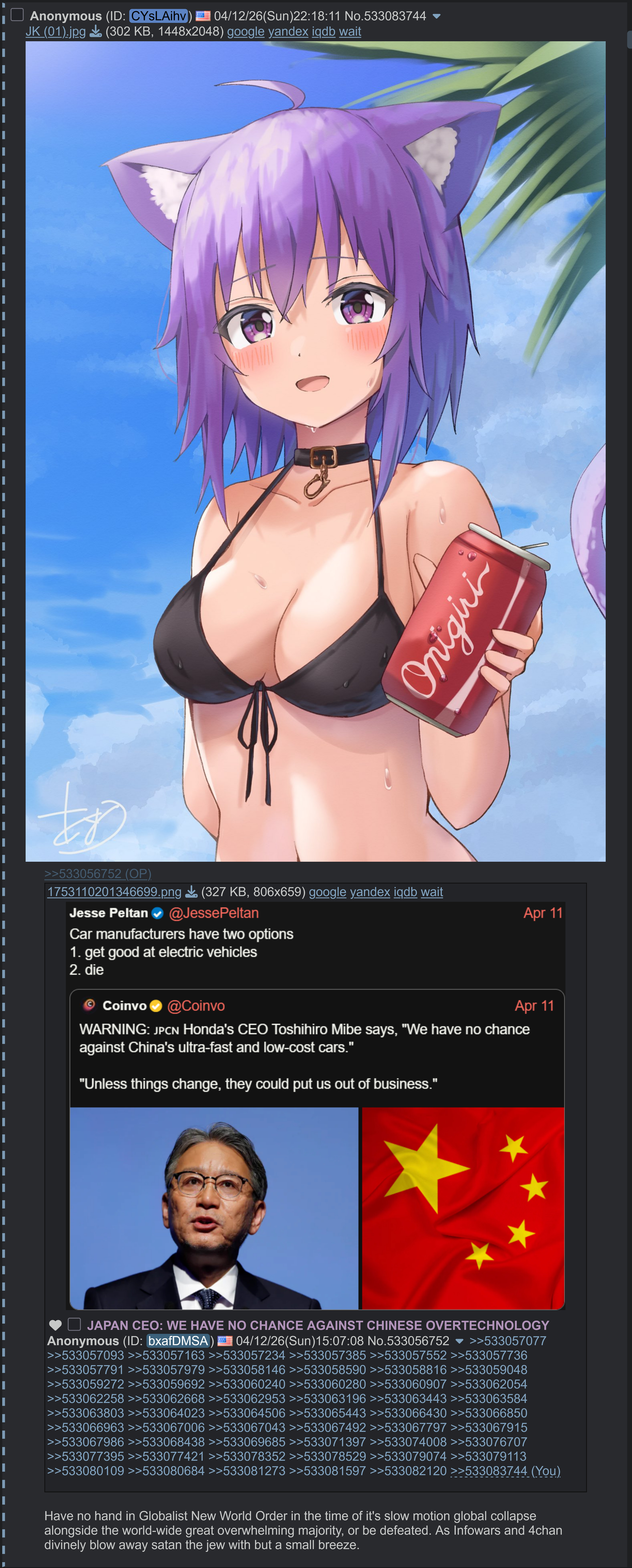 >>533056752Wow, yes, making a cheaper product of comparable quality will result in your shit getting pushed in as a competitor, sugoi, Toshihiro-sama. They will survive, obviously, by pressuring the Government to apply tariffs on EVs and delay updating the country's infrastructure to make them even less attractive to the local population.