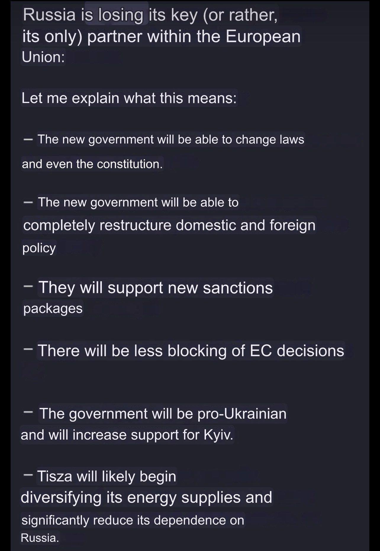 Im happy orban is out but you guys need to be realistic. All talks about taking Russias land and whatnot fail to consider that Russia has nukes, and nukes are the ultimate nuh huh type button. Russia is gonna be shitty as fuck than it was before for sure, but it will remain a nation. What happens in a 100, 200 years from now after they recover from ass damage like China is where the real danger lies.