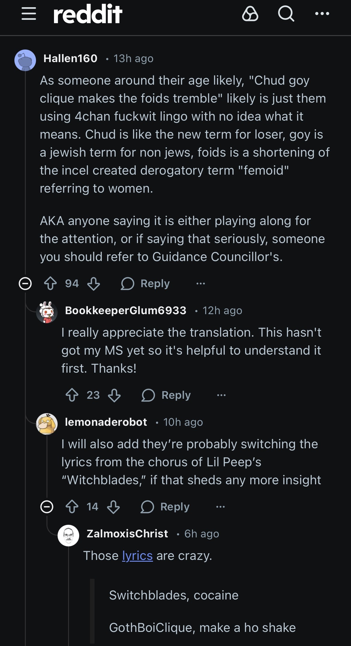 >>533066055So the original lyrics are "Gothboi clique" but as a zillenial this was very funny to read