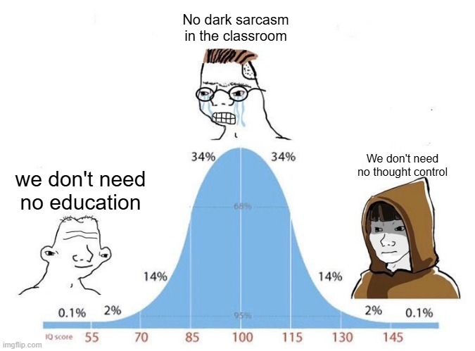 >>533066055>create education system that villainizes young boys and systematically denies them opportunity>generations of boys are broken by it and those who try to comply still get treated like shit>try to push the idea that boys wanting to be treated with some modicum of dignity is evil and dangerous>boys who've seen this process play out multiple times on male relatives and friends know that their only hope of not being liquidated by the system is to fight back>be surprised that the boys are rebellingThese people are so fucking dumb it hurts, and we all know that their next step is going to be to try and face it with EVEN MORE authoritarian policies instead of trying to understand the boys and provide them with the necessary incentives to behave