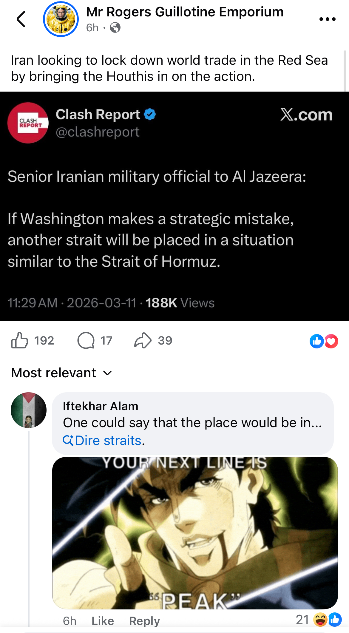 >Sure, their entire navy, air force, and radar are crippled...and the US is now making bank on every oil tanker in the world redirecting and refueling there. But Iran is winning!Why are people so worried about AI deepfakes when you can just blatantly spread absurd clownworld levels of bullshit and still have many believe it?
