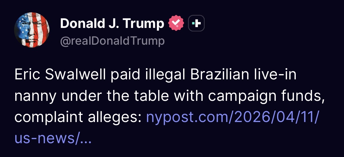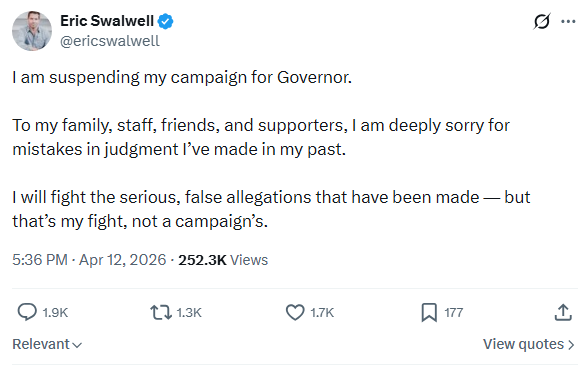ERIC SWALWELL SUSPENDS CAMPAIGNhttps://x.com/ericswalwell/status/2043488502327972096
