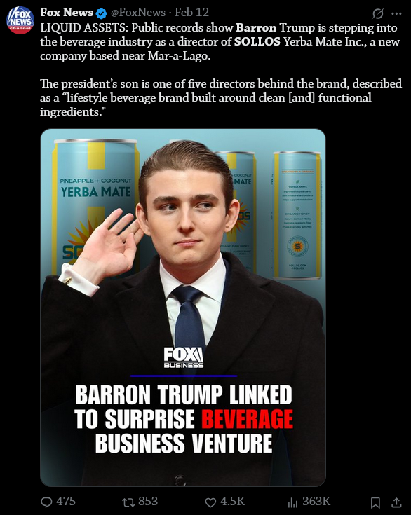 Apparently Barron's starting his own drink companyhttps://x.com/FoxNews/status/2022057874378162428