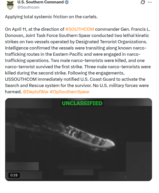 Applying total systemic friction on the cartels. On April 11, at the direction of SOUTHCOM commander Gen. Francis L. Donovan, Joint Task Force Southern Spear conducted two lethal kinetic strikes on two vessels operated by Designated Terrorist Organizations. Intelligence confirmed the vessels were transiting along known narco-trafficking routes in the Eastern Pacific and were engaged in narco-trafficking operations. Two male narco-terrorists were killed, and one narco-terrorist survived the first strike. Three male narco-terrorists were killed during the second strike. Following the engagements, USSOUTHCOM immediately notified U.S. Coast Guard to activate the Search and Rescue system for the survivor. No U.S. military forces were harmed.https://x.com/Southcom/status/2043477652573470959
