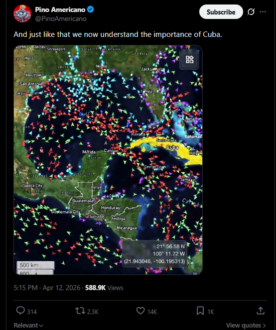 >>533076403Also remember the importance of Cuba and Venezuela lmaohttps://x.com/PinoAmericano/status/2043437956606661082Where are the faggots who said venezuela oil was trash