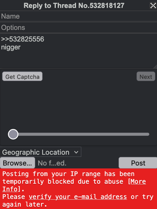 >>533072415>>533073542Yeah, this is how they are censoring posts now. I got my first range ban for posting an image of a jew from a jew I was talking to. 4chan is infiltrated. Just open an email exclusive to 4jews and follow the verify email process. Then you can bypass range bans.