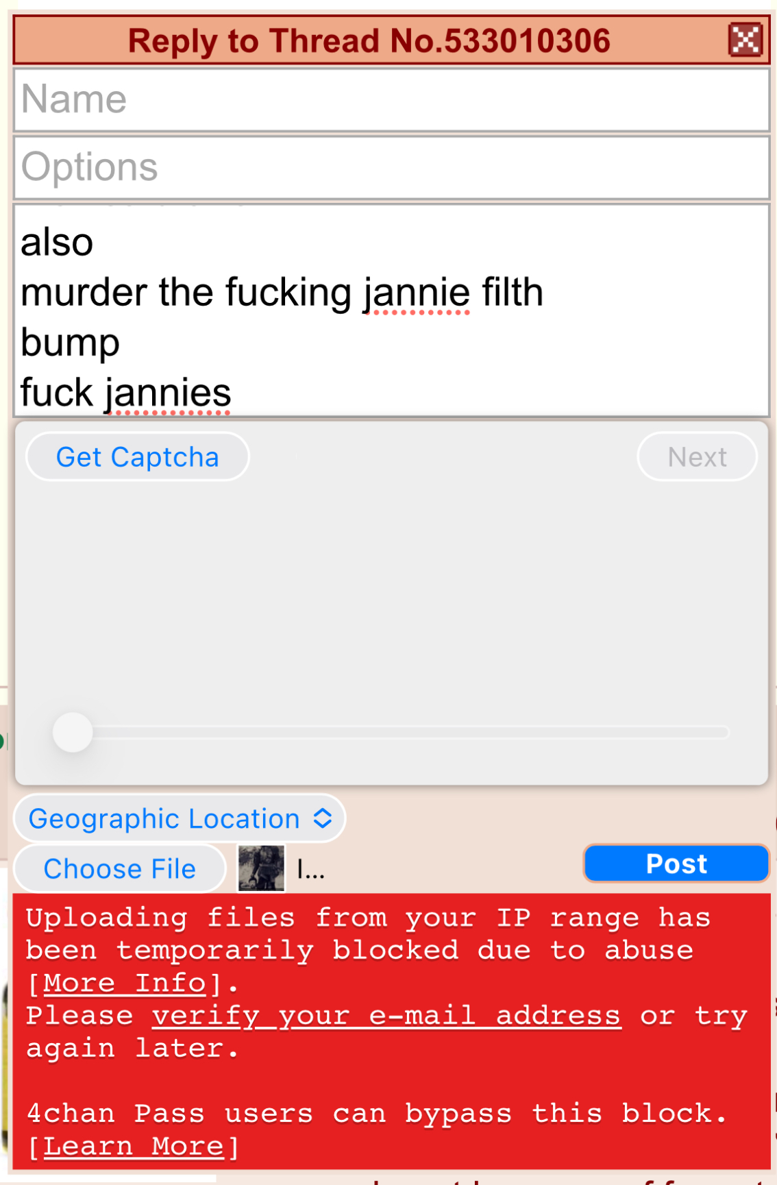 >>533080773To add, if your PC is banned just switch your ISP. Usually you get one code and thats where you are stuck at but most companies have multiple. You just get targeted because some dude posted CP or "advocated for child pornography"
