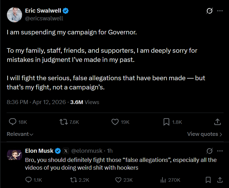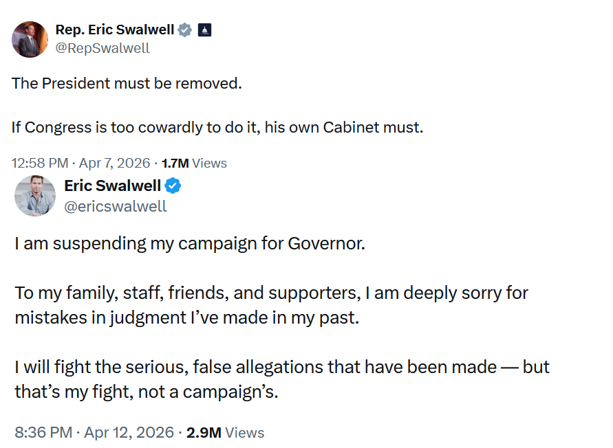 5 days apart.https://x.com/RepSwalwell/status/2041561246462570837https://x.com/ericswalwell/status/2043488502327972096