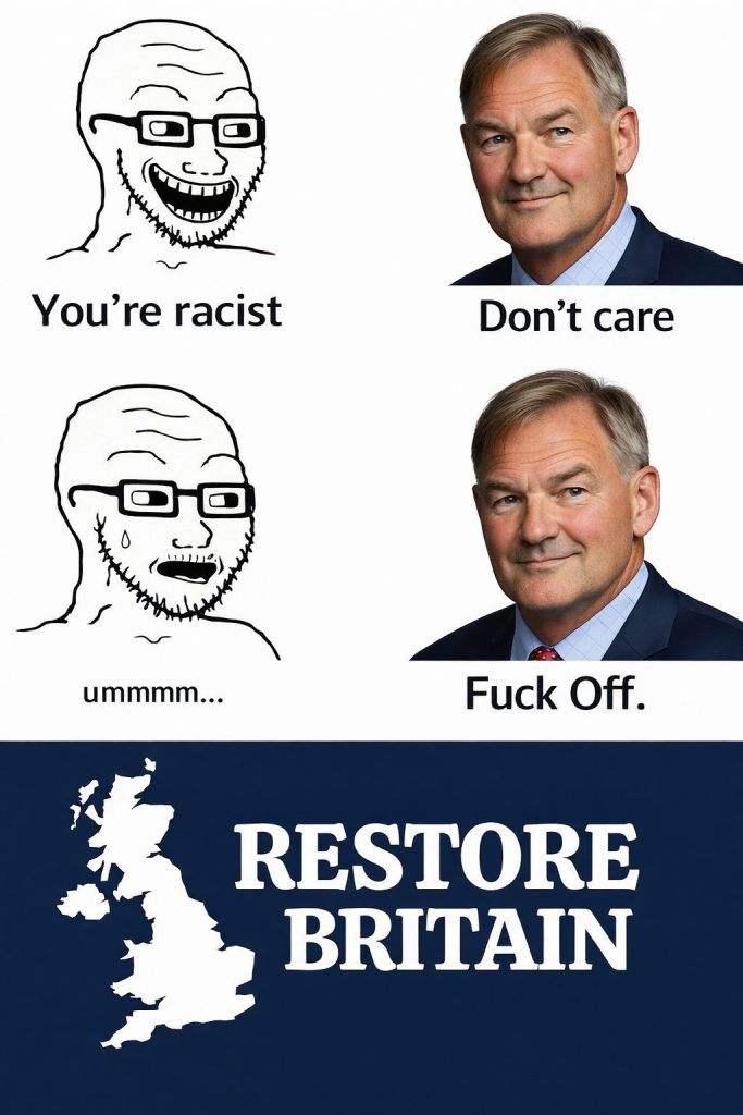 I’d vote Green over Restore. Restore is literally just a bunch of posh Tory boys filling out their CVs until they can get a better job at CCHQ after Reform loses. At least the Greens are a sincere party (no matter what you think of their policies) and not a psyop constructed around one old man’s hateboner for another party.