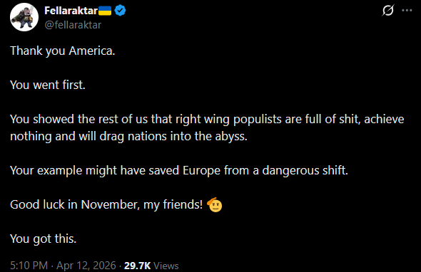 He's right. Thanks to Trump right wing politics is dead. GLOBALLY. And with the blue tsunami coming in the 2026, and 2028 be prepared for hundreds of years of left wing rule of the planet. Rightoids electing Trump for the third time killed right wing politics.Congrats.