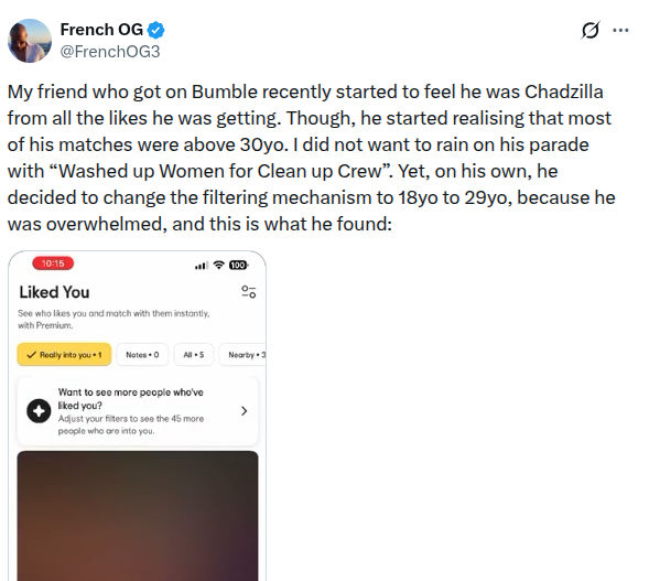 It all depends on you dude. If you barely stabilized financially while driving a 10+ years old car, are skinny fat/chubby and balding while looking like 45 at the age of 35 then yeah no woman in her 20s will want you. I look great for my age though and had girls in their early 20s openly hitting on me. It's literally a skill issue. The stats don't lie, there's a 30% gap between single women and men in their 20s, which means women do in fact date up in age.