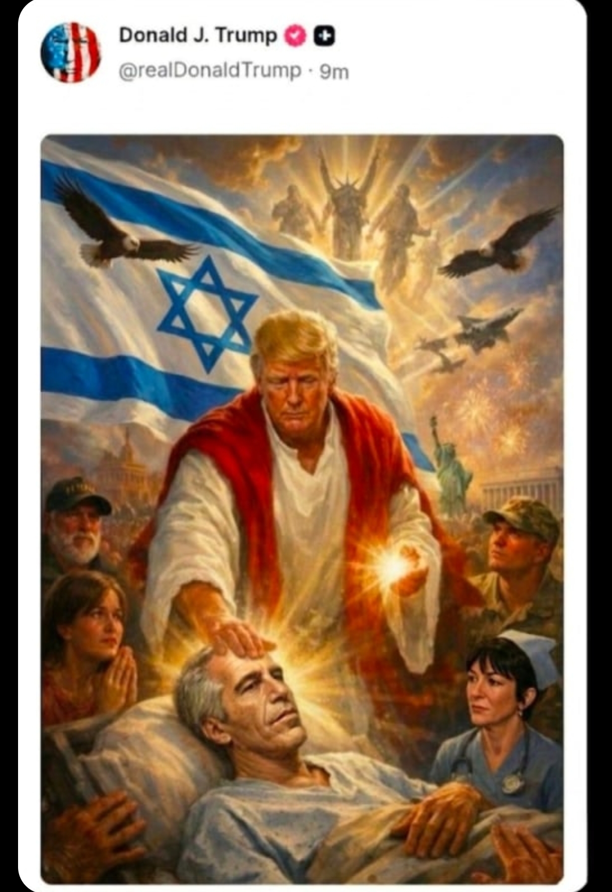 >>533103287Soon after, trump posted a picture of him as Jesus, healing what appears to be Jeffrey Epstein, while flanked by fighter jets and headless demons.Honest question for our americans posters, how does it feel to have elected the most retarded anti-Christ possible?