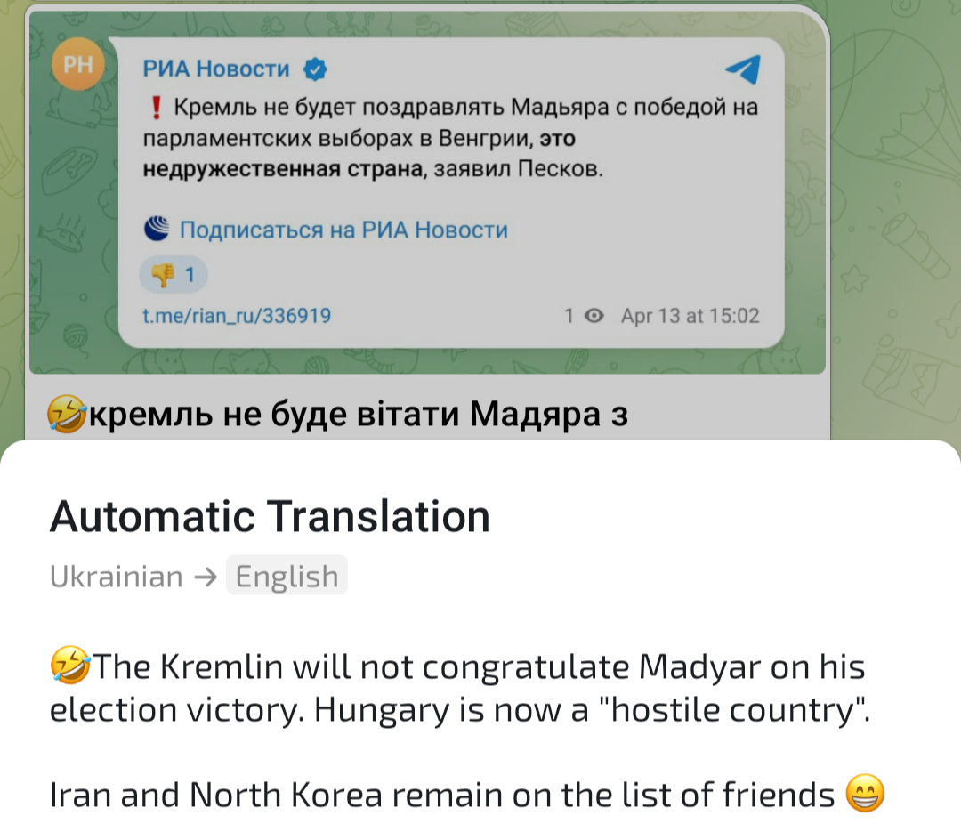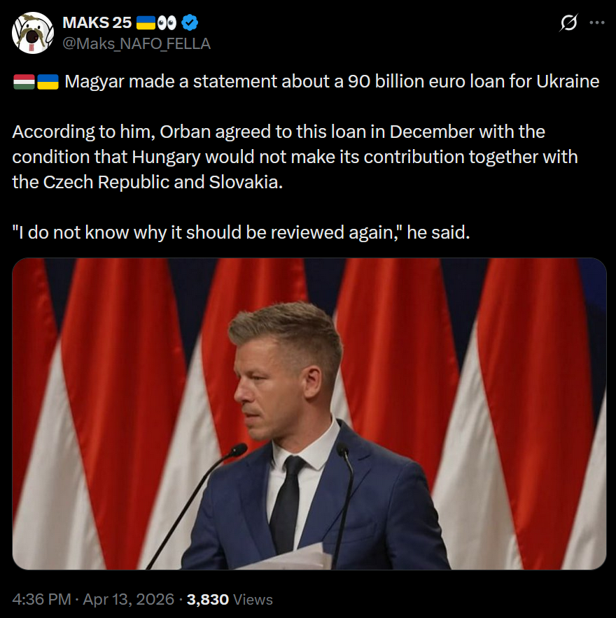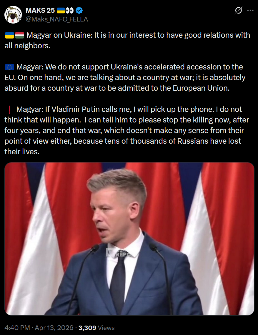 >"The Kremlin has spoken, and Beijing has spoken. I thank them for their respectful acceptance of the decision of the Hungarian electorate, the Hungarian people, and they are also open to pragmatic cooperation, just as Hungary is, because geography is geography." - Peter MagyarOh no, he was supposed to say Putler is evil and give all his money to ukranny!