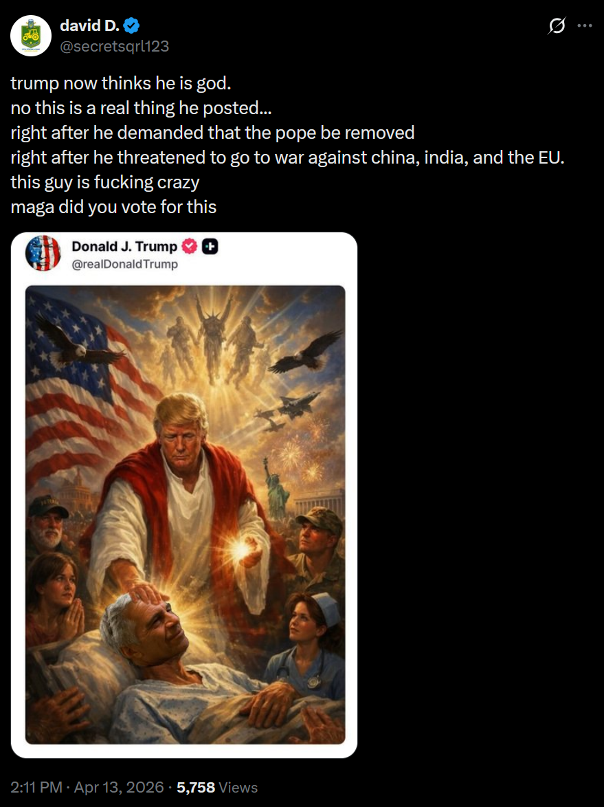 Hegseethe got so mad that Pope Leo didn't help him LARP as a crusader that he got daddy trump to rage post at the Pope.