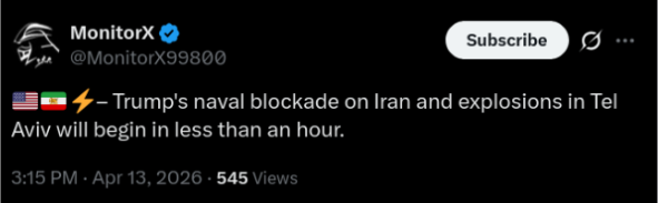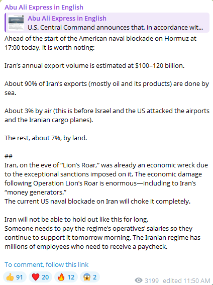 >U.S. Central Command announces that the naval blockade against Iran will start tomorrow at 10 AM Eastern Time.